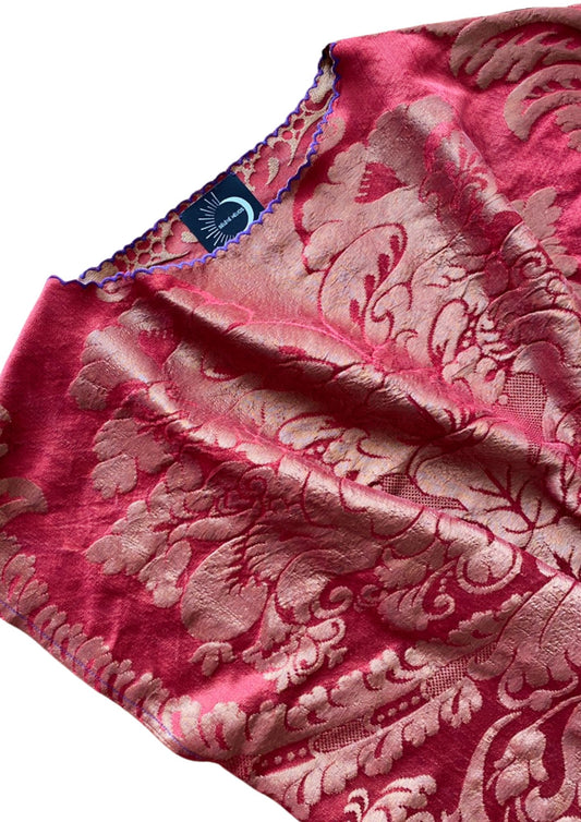 Ce sac est tout simplement sublime, tant par la beauté de sa forme, que des matières exceptionnelles qui le composent issues des rideaux de palace. C’est un petit bijoux unique en son genre qui a lui seul habille une tenue pour toute occasion. Aussi bien en mode décontracté ou plus élaboré.